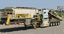 Some crushers are mobile and can crush rocks as large as 1.5 meter (60 inches). Primarily used in-pit at the mine face these units are able to move with the large infeed machines (mainly shovels) to increase the tonnage produced. In a mobile road operation, these crushed rocks are directly combined with concrete and asphalt which are then deposited on to a road surface. This removes the need for hauling oversized material to a stationary crusher and then back to the road surface.
