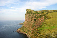 The location of the world's highest sea cliffs depends also on the definition of 'cliff' that is used. Guinness World Records states it is Kalaupapa, Hawaii,[5] at 1,010 m high. Another contender is the north face of Mitre Peak, which drops 1,683 m to Milford Sound, New Zealand.[6] These are subject to a less stringent definition, as the average slope of these cliffs at Kaulapapa is about 1.7, corresponding to an angle of 60 degrees, and Mitre Peak is similar. A more vertical drop into the sea can be found at Maujit Qaqarssuasia (also known as the 'Thumbnail') which is situated in the Torssukátak fjord area at the very tip of South Greenland and drops 1,560 m near-vertically.[7]