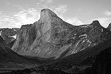 of Baffin Island, rises 4,300 ft above the flat frozen fjord, although the lower portion of the face breaks from the vertical wall with a series of ledges and buttresses.[10]