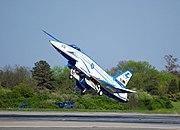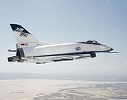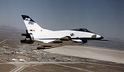 Two X-31s were built, with the first flying on October 11, 1990.[2] Over 500 test flights were carried out between 1990 and 1995. The X-31 is a canard delta, a delta wing aircraft which uses canard foreplanes for primary pitch control, with secondary thrust-vectoring control. The canard delta had earlier been used on the Saab Viggen strike fighter, and has since become common on fighters such as the Eurofighter Typhoon, Dassault Rafale and Gripen which were all designed and flew several years before the X-31. The X-31 featured a cranked-delta wing (similar to the Saab 35 Draken and the F-16XL prototype), and fixed strakes along the aft fuselage, as well as a pair of movable computer-controlled canards to increase stability and maneuverability. There are no moveable horizontal tail surfaces, only the vertical fin with rudder. Pitch and yaw are controlled by the canard with the aid of the three paddles directing the exhaust (thrust vectoring). Eventually, simulations and flight tests on one of the X-31s showed that flight would be stable without the vertical fin, because the thrust-vectoring nozzle provided sufficient yaw and pitch control.[3]