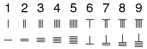 Rod numerals is the only numeric system that uses different placement combination of a single symbol to convey any number or fraction in the Decimal System. For numbers in the units place, every vertical rod represent 1. Two vertical rods represent 2, and so on, until 5 vertical rods, which represents 5. For number between 6 and 9, a biquinary system is used, in which a horizontal bar on top of the vertical bars represent 5. The first row are the number 1 to 9 in rod numerals, and the second row is the same numbers in horizontal form.