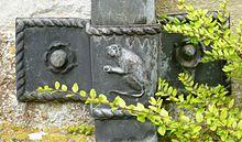 The north facade has a gabled porch bay which includes an arched doorway with a stone monogram above.[10] On each side of the entrance bay, there are two gables, with bays where the wings are set at an angle. The north-west wing includes a chapel, with a twin-arched loggia and its own porch. The east wing was previously the service wing. The building's rainwater pipes are embossed with animals and flowers.[10]