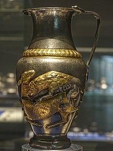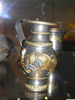 It consists of 165 receptacles, including 108 phiales, 55 jugs and 3 goblets.[2] The objects are silver with golden gilt on some of them with total weight of more than 20 kg. The treasure is an invaluable source of information for the life of the Thracians, due to the variety of motifs in the richly decorated objects. It is dated back to the 5th–4th centuries B.C.