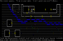 Ancient Domains of Mystery (1994), or ADOM for short, derived from concepts presented in NetHack. ADOM was originally developed by Thomas Biskup while a student at Technical University of Dortmund.[59] After playing through Rogue and Hack, he came to NetHack and was inspired by the game but dismayed at the complexity and elements he found unnecessary or distracting. Biskup created ADOM from scratch with the aim of creating a more story-driven game than NetHack that kept the depth of gameplay with a focused theme and setting.[59] The resulting game featured several different dungeons, many generated procedurally, connected through an overworld map of the fictional realm of Ancardia, and would have the player complete various quests in those dungeons to progress the game. A major feature was the influence of Chaos forces through unsealed portals, which the player would have to close. While in areas affected by Chaos, the player's character would become tainted, causing mutations that could be either detrimental or beneficial.[59] ADOM, like NetHack and Angband, would gain a devteam to maintain the code and implement updates and patches to avoid excessive forking.[59]