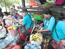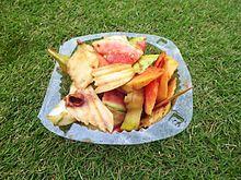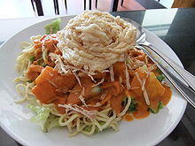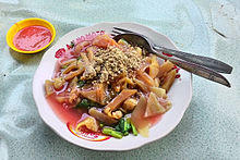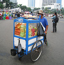 Rujak is available everywhere across Indonesia, and there are rich variations within the country. The most popular rujak variant is rujak buah (fruit rujak), which is mixed sliced fruit and vegetables served with a spicy palm sugar dressing.[7] Unlike common fruit salads, rujak is often described as tangy and spicy fruit salad due to its sweet, hot and spicy dressing made from ground chilli, palm sugar and peanuts.[8] It is a popular street fare in Bali.[9]