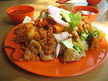 Rojak (Malay spelling) or Rujak (Indonesian spelling) is an Indonesian — Javanese traditional fruit and vegetable salad dish, commonly found in Indonesia, Malaysia and Singapore.[2][3] Other than referring to this fruit salad dish,[4] the term rojak also means "mixture" or "eclectic mix" in colloquial Malay.[5][6]