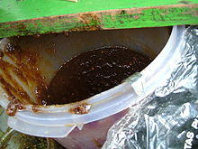 The bumbu rujak or thick sweet spicy rujak dressing is poured on the fruit slices. An addition of sambal garam powder (a simple mixture of salt and ground red chilli) is put on side as the alternative for those who prefer a salty taste for their rujak. The Javanese people call this kind of rujak as lotis.[20]