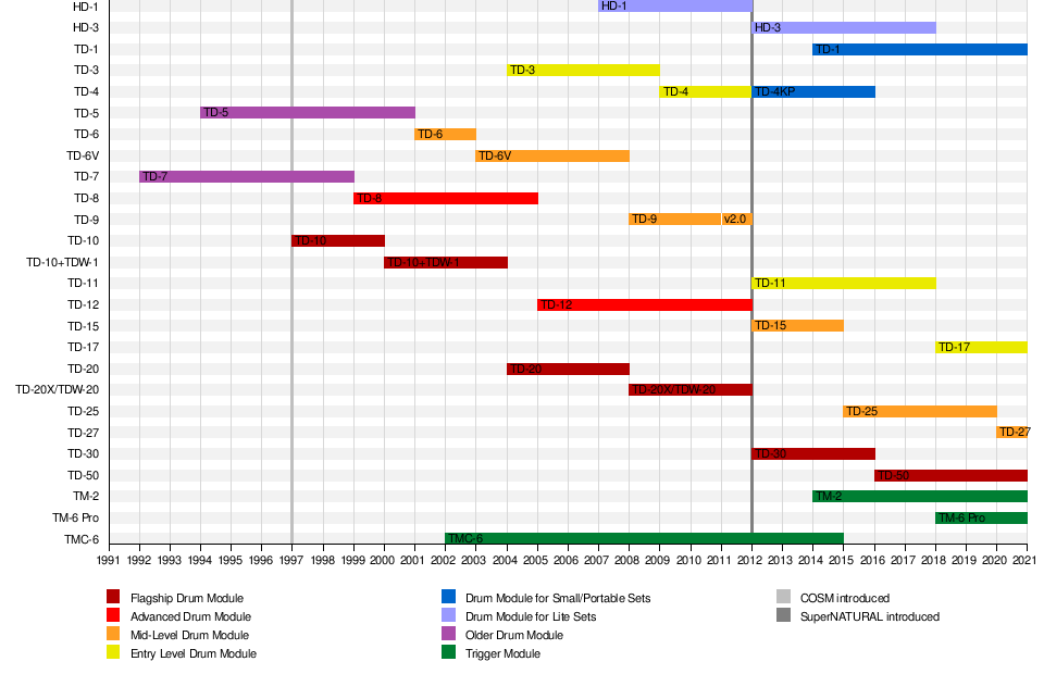 | TD-10K | V-Concert | 1997-2000 | TD-10 | KD-7 | PD-120 | 2x PD-100, 1x PD-120 | PD-7 / FD-7 | 3x PD-9 | MDS-10 |