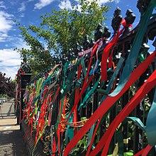 A community response during the Royal Commission into Institutional Responses to Child Sexual Abuse was "Loud Fence", which was started by St. Patrick's College school principal John Crowley who urged the public to tie ribbons to the school fence before the Royal Commission hearing commenced. He credits the idea and name to an unnamed local survivor, with another survivor coming up with the term "No more silence" in February 2014.[46] John was the person who tied the first ribbon.[47] By the day of the first hearing, ribbons had been tied to not only the school fence, but also to the fence of St Alipius Primary School, St Patrick's Cathedral, the entrances to Ballarat East, as well as outside the Ballarat Courts. Survivors at the hearing wore a ribbon pinned to their lapels. After the hearings had started, ribbons were taken down from St Alipius and some members of the community tied them back up. One of those, Maureen Hatcher, then started a Facebook page called "Loud Fence" which is still in operation.[48][49] Places that had a history of sexual abuse were marked with ribbons as a sign of support for the victims. The Loud Fence movement also spread internationally, with survivors taking it to Rome[50] and even speaking about it at a University in Rome.[51] There was also a Loud Fence march in Ballarat.[52] The diocese removed the ribbons three days after the Royal Commission in to Institutional Responses to Child Sexual Abuse published its final recommendations.[53][54]