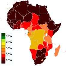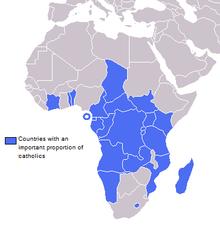 Yet, at least outside the Islamic majority parts of northern Africa, the presence of the Catholic Church has recovered and grown in the modern era in Africa as a whole, one of the reasons being the French colonization of several countries in Africa.[1] Catholic Church membership rose from 2 million in 1900 to 140 million in 2000.[2] In 2005, the Catholic Church in Africa, including Eastern Catholic Churches, embraced approximately 135 million of the 809 million people in Africa. In 2009, when Pope Benedict XVI visited Africa, it was estimated at 158 million.[3] Most belong to the Latin Church, but there are also millions of members of the Eastern Catholic Churches. By 2025, one-sixth (230 million) of the world's Catholics are expected to be Africans.[4][5]