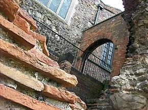 When brick production resumed in earnest on the British Isles, the 1½" to 2" height of the Roman-style brick gradually increased during the early Medieval period.[12] Brick from the Ancient Roman Empire was commonly reused in medieval Europe as well as in later periods.[13] This reuse can be found across the former Roman Empire.[13] In Great Britain, where construction materials are less plentiful, Roman structures were quarried for their stone and brick and it was commonly reused.[14] Examples of this type of reuse in Great Britain can be found in Anglo-Saxon churches at Brixworth, Corbridge, St. Martin's, Canterbury, and St Nicholas', Leicester, and also in St Albans Abbey church (now St Albans Cathedral).[14][15]