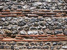 When building in masonry, the Romans often interspersed the stonework at set intervals with thin courses of bricks, sometimes known as "bonding tiles".[9] This practice gave the structure added stability. It also had a secondary aesthetic effect of creating a polychromatic appearance. From an engineering point of view, the tiles were introduced to level up the bed when building with irregularly shaped building materials such as flint. The setting out engineer would have introduced timber profiles for the masons to check the levels using a traveller.