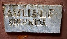 - ^ Evidently there were exceptions to this as well. CIL ii. 4566 gives the name Fabia Domitia Ɔ. f. Secunda, in which Ɔ. f. can only be read "Gaiae filia" (the use of an inverted C. for "Gaia" was common in the filiations of freedmen, but apparently not restricted to them; see below); this may be the same woman referred to as Fabia Domitia D. f. Secunda, CIL ii. 1806, in the latter case giving her father's name. Both inscriptions are from Roman Spain, and are also notable for the doubled nomen and for the cognomen Secunda, which in this case is really a praenomen placed after the filiation, a common practice in Roman women's names of this period.