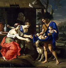 The praenomen was a true personal name, chosen by a child's parents, and bestowed on the dies lustricius, or "day of lustration", a ritual purification performed on the eighth day after the birth of a girl, or the ninth day after the birth of a boy.[iv] Normally all of the children in a family would have different praenomina.[v] Although there was no law restricting the use of specific praenomina,[vi] the choice of the parents was usually governed by custom and family tradition. An eldest son was usually named after his father, and younger sons were named after their father's brothers or other male ancestors. In this way, the same praenomina were passed down in a family from one generation to the next. Not only did this serve to emphasize the continuity of a family across many generations, but the selection of praenomina also distinguished the customs of one gens from another. The patrician gentes in particular tended to limit the number of praenomina that they used far more than the plebeians, which was a way of reinforcing the exclusiveness of their social status.[8]