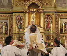 The Roman Rite is noted for its sobriety of expression.[2] In its Tridentine form, it was noted also for its formality: the Tridentine Missal minutely prescribed every movement, to the extent of laying down that the priest should put his right arm into the right sleeve of the alb before putting his left arm into the left sleeve (Ritus servandus in celebratione Missae, I, 3). Concentration on the exact moment of change of the bread and wine into the Body and Blood of Christ has led, in the Roman Rite, to the consecrated Host and the chalice being shown to the people immediately after the Words of Institution. If, as was once most common, the priest offers Mass while facing ad apsidem (towards the apse), ad orientem (towards the east) if the apse is at the east end of the church, he shows them to the people, who are behind him, by elevating them above his head. As each is shown, a bell (once called "the sacring bell") is rung and, if incense is used, the host and chalice are incensed (General Instruction of the Roman Missal, 100). Sometimes the external bells of the church are rung as well. Other characteristics that distinguish the Roman Rite from the rites of the Eastern Catholic Churches are genuflections and keeping both hands joined together.