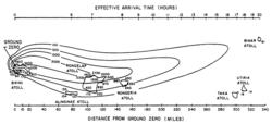 From 1946 through 1958 the United States military conducted numerous atmospheric nuclear weapons tests, including hydrogen bomb tests, primarily at Bikini Atoll, about 120 kilometres (75 mi) from Rongelap Atoll. On March 1, 1954, the testing of the Castle Bravo hydrogen device produced an explosion that was 2½ times more powerful than predicted, and produced unexpected amounts of fallout[8] that resulted in widespread radioactive contamination.[9][10][11] The blast cloud contaminated more than 7,000 square miles (18,000 km2) of the surrounding Pacific Ocean including some of the then inhabited surrounding islands including Rongerik Atoll, Rongelap Atoll (120 kilometres (75 mi) away) and Utirik Atoll.[12]
