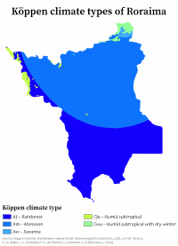 Except for the higher mountains where the climate is cooler but very wet, Roraima has an equatorial climate. This is a type of tropical climate in which there is no dry season: all months have mean precipitation values of at least 60 mm. It is usually found at latitudes within five degrees of the equator, which are dominated by the Intertropical Convergence Zone. The equatorial climate is denoted Af in the Köppen climate classification. Tropical rainforest is the natural vegetation in the equatorial regions.