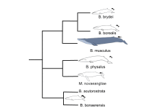 Formerly, the rorqual family Balaenopteridae was split into two subfamilies, the Balaenopterinae and the Megapterinae, with each subfamily containing one genus, Balaenoptera and Megaptera, respectively. However, the phylogeny of the various rorqual species shows the current division is paraphyletic, and in 2005, the division into subfamilies was dropped.[14] The discovery of a new species of balaenopterid, Omura's whale (Balaenoptera omurai), was announced in November 2003, which looks similar to, but smaller than, the fin whale; individuals of this species were found in Indo-Pacific waters. The discovery of the highly endangered Rice's whale was announced in 2021 after a genetic study found it to be distinct from Eden's whale; this species is known from a small portion of the northeastern Gulf of Mexico.[15]