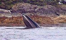 As well as other methods, rorquals obtain prey by lunge-feeding on bait balls.[10] Lunge feeding is an extreme feeding method, where the whale accelerates to a high velocity and then opens its mouth to a large gape angle. This generates the water pressure required to expand its mouth and engulf and filter a huge amount of water and fish.[10]