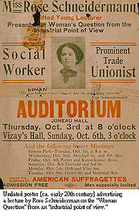 In 1912, on behalf of the National Woman Suffrage Association (NWSA), she traveled throughout Ohio's industrial cities, giving lectures to working men to garner support for a state suffrage referendum. To win men's support, she emphasized how beneficial the enfranchisement of working women would be for labor issues. As she later explained, "My argument to them was that if their wives and daughters were enfranchised, labor would be able to influence legislation enormously."[6] While Schneiderman was hailed as a powerful speaker, the 1912 referendum did not pass, and it would not be until 1923 – after the passage of the federal Nineteenth Amendment that granted women the right to vote - that the phrase "white male," in reference to voting, would be removed from the Constitution of Ohio.[7]