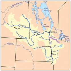 The Roseau River is a 214-mile-long (344 km)[1] tributary of the Red River of the North, in southern Manitoba in Canada and northwestern Minnesota in the United States. Via the Red River, Lake Winnipeg and the Nelson River, it is part of the watershed of Hudson Bay.