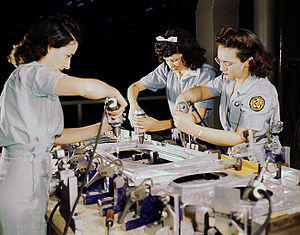 Women quickly responded to Rosie the Riveter, who convinced them that they had a patriotic duty to enter the workforce. Some claim that she forever opened the work force for women, but others dispute that point, noting that many women were discharged after the war and their jobs were given to returning servicemen.[29] These critics claim that when peace returned, few women returned to their wartime positions and instead resumed domestic vocations or transferred into sex-typed occupations such as clerical and service work.[30] For some, World War II represented a major turning point for women as they eagerly supported the war effort, but other historians emphasize that the changes were temporary and that immediately after the war was over, women were expected to return to traditional roles of wives and mothers. A third group has emphasized how the long-range significance of the changes brought about by the war provided the foundation for the contemporary woman's movement.[31] Leila J. Rupp in her study of World War II wrote "For the first time, the working woman dominated the public image. Women were riveting housewives in slacks, not mother, domestic beings, or civilizers."[32]