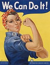 Rosie the Riveter was an allegorical cultural icon of World War II, representing the women who worked in factories and shipyards during World War II, many of whom produced munitions and war supplies.[1][2] These women sometimes took entirely new jobs replacing the male workers who joined the military. Rosie the Riveter is used as a symbol of American feminism and women's economic advantage.[3] Similar images of women war workers appeared in other countries such as Britain and Australia. The idea of Rosie the Riveter originated in a song written in 1942 by Redd Evans and John Jacob Loeb. Images of women workers were widespread in the media in formats such as government posters, and commercial advertising was heavily used by the government to encourage women to volunteer for wartime service in factories.[4] Rosie the Riveter became the subject and title of a Hollywood film in 1944.