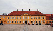 Adjacent to the cathedral is Roskilde Palace, built from 1733 to 1736 on the site of the former residence of the bishops of Roskilde. It was used by members of the royal family when they were in the city or attended funerals. Today it houses the Museum of Contemporary Art.[55][56] During the English siege of Copenhagen in 1807, the mansion served as headquarters of General Wellesley, the future Duke of Wellington. Built in the Baroque style with yellow-rendered masonry and red tile roofing, the four-winged complex consists of a two-storey main wing, two one-storey lateral wings and a curved gate wing opening onto the Stændertorvet. The four wings are connected by curving galleries. Facing the courtyard, the façade of the main wing has pilasters and a median risalit tipped by a triangular pediment decorated with the royal coat of arms.[57]