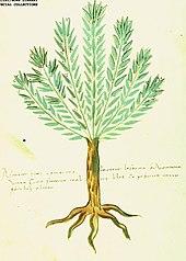The first mention of rosemary is found on cuneiform stone tablets as early as 5000 BC.[11] After that not much is known, except that Egyptians used it in their burial rituals.[12] There is no further mention of rosemary until the ancient Greeks and Romans. Pliny the Elder (23–79 AD) wrote about it in The Natural History,[13] as did Pedanius Dioscorides (c. 40 to c. 90), a Greek botanist (amongst other things). He talked about rosemary in his most famous writing, De Materia Medica, one of the most influential herbal books in history.