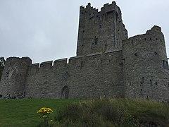 The castle is typical of strongholds of Irish chieftains built during the Middle Ages. The tower house had square bartizans on diagonally opposite corners and a thick end wall. The tower was originally surrounded by a square bawn defended by round corner towers on each end.[4]
