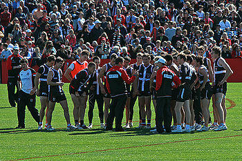 St Kilda made a number of changes to their coaching and playing staff in the 2008/09 pre-season, adding Geelong assistant coach Leigh Tudor as the forward coach. Over the pre-season Lyon worked on a new game plan based around forward pressure, midfield zone defence and pushing numbers behind the ball. This was the platform for a record-breaking year. St Kilda won 19 consecutive matches, including a game described by some observers as one of the best home-and-away clashes of all time in Round 14 against Geelong (who were also undefeated at the time).[9] Despite losing narrowly to Essendon and North Melbourne late in the season, the Saints finished two-games clear on top of the AFL ladder, winning the McLelland Trophy for the first time since 1997.[10]
