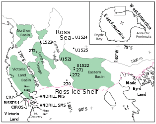 Drill holes have recovered cores of rock from the western edges of the sea. The most ambitious recent efforts are the Cape Roberts Project (CRP) and the ANDRILL project.[18][19][20] Deep Sea Drilling Project (DSDP) Leg 28 completed several holes (270-273) farther from land in the central and western portions of the sea.[21] These resulted in defining a stratigraphy for most of the older glacial sequences, which comprise Oligocene and younger sediments. The Ross Sea-wide major unconformity RSU-6 has been proposed to mark a global climate event and the first appearance of the Antarctic Ice Sheet in the Oligocene.[22][23][24]