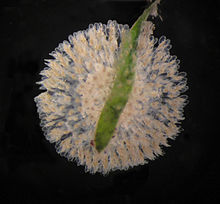 Colony of Sinantheria socialis on an Elodea densa leaf . Note heart-shaped corona of individuals.