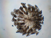 Some rotifers are free swimming and truly planktonic, others move by inchworming along a substrate, and some are sessile, living inside tubes or gelatinous holdfasts that are attached to a substrate. About 25 species are colonial (e.g., Sinantherina semibullata), either sessile or planktonic. Rotifers are an important part of the freshwater zooplankton, being a major foodsource and with many species also contributing to the decomposition of soil organic matter.[3] Most species of the rotifers are cosmopolitan, but there are also some endemic species, like Cephalodella vittata to Lake Baikal.[4] Recent barcoding evidence, however, suggests that some 'cosmopolitan' species, such as Brachionus plicatilis, B. calyciflorus, Lecane bulla, among others, are actually species complexes.[5][6]