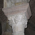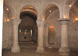 The upper matronaeum has also eight columns which creates a circular ambulatory facing the central hollow of the lower section. It has also a small apse with traces of frescoes. The capitals on both floors, and the portal, have well sculpted zoomorphic, human and geometric figures