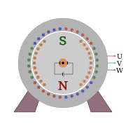 The rotor is a large magnet with poles constructed of steel lamination projecting out of the rotor’s core.[7] The poles are supplied by direct current or magnetized by permanent magnets.[8] The armature with a three-phase winding is on the stator where voltage is induced. Direct current (DC), from an external exciter or from a diode bridge mounted on the rotor shaft, produces a magnetic field and energizes the rotating field windings and alternating current energizes the armature windings simultaneously.[7][8]