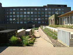 The site was redeveloped by the University into a public park designed by Gross Max landscape architects. Known as Rottenrow Gardens, the centrepiece of the park is George Wyllie's 'Monument to Maternity', a sculpture depicting a giant metal nappy pin. The front and side porticos, foundation and basement walls of the Maternity Hospital were preserved, and incorporated into the design of the park. Rottenrow Gardens was officially opened on 25 June 2004 as part of the University's 40th anniversary celebrations by the Lord Provost of Glasgow, Councillor Liz Cameron.[2] Some elements of the park will be permanent, others being temporary in anticipation of future Strathclyde campus expansion and renewal.