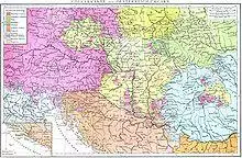 The Treaty of Küçük Kaynarca authorised the Russian ambassador in Istanbul to defend the autonomy of Moldavia and Wallachia (known as the Danubian Principalities) in 1774.[130] Taking advantage of the Greek War of Independence, a Wallachian lesser nobleman, Tudor Vladimirescu, stirred up a revolt against the Ottomans in January 1821, but he was murdered in June by Phanariot Greeks.[131] After a new Russo-Turkish War, the Treaty of Adrianople strengthened the autonomy of the Danubian Principalities in 1829, although it also acknowledged the sultan's right to confirm the election of the princes.[132]