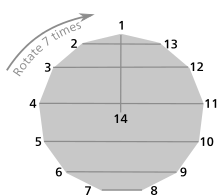 This constitutes a schedule where player 14 has a fixed position, and all other players are rotated clockwise positions. This schedule is easily generated manually. To construct the next round, the last player, number 8 in the first round, moves to the head of the table, followed by player 9 against player 7, player 10 against 6, until player 1 against player 2. Arithmetically, this equates to adding to the previous row, with the exception of player . When the result of the addition is greater than , then subtract .