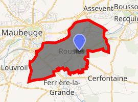 The arms of Rousies are blazoned : Quarterly 1&4: Argent, 3 fesses gules; 2&3: Argent, 3 wagoner's axes top 2 addorsed gules. [2](Bermerain, Étrœungt, Féron, Ferrière-la-Grande, Lez-Fontaine, Rousies, Solre-le-Château and Solrinnes use the same arms.)