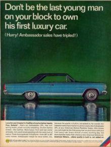 Abernethy said repeatedly that AMC's "main problem was its image lag — the fact that too many people still thought of American Motors as the builder of plain jane compacts."[19] He also started to move the Ambassador upscale to compete with other manufacturers' full-size cars. Moreover, larger models typically return bigger profits. Offering larger, and often more prestigious or "halo cars", can also help make the firm's smaller models look more attractive to consumers. Thus, as part of this vision, Abernethy put into motion a total remake of AMC's corporate identity and its marketing mix that would divorce its larger car lines from its Rambler brand and his perceived "negative" compact car image.