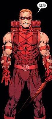 After the death of Oliver Queen, Roy moved to Metropolis.[8] During a reunion with Dick, Wally, and Garth, Roy faced the villain Haze, who made Roy face an image of his ideal self, which was him in a red version of the Green Arrow suit.[9] To honor Ollie after his recent death, Roy embraced this and took on the red Green Arrow suit fully and went back to using a bow as his primary weapon.[10] He joined the new Teen Titans team, acting as an experienced mentor to the younger new heroes along with fellow first generation Titan Lilith Clay.