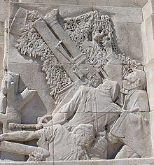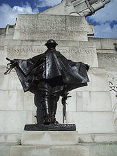 The Royal Artillery Memorial is 43 feet long, 21 feet wide and 30 feet high (13 metres by 6 metres by 9 metres); the pedestal and the one-third over-lifesize replica of a BL 9.2-inch howitzer, modelled on a gun in the Imperial War Museum, that sits on top of it are made of Portland stone.[3][7][37] The plinth is in the form of a squat Roman cross. Cast by the A. B. Burton foundry, bronze figures are placed at the ends of each arm—an artillery captain holding a greatcoat at the front (facing south, below the barrel of the howitzer); a shell carrier on the east side; a driver wearing a heavy cape to the west; and to the north, a dead soldier on the north, his greatcoat thrown over him and his helmet resting on his chest.[38][39][40][41] Carved stone reliefs show various detailed military scenes from the First World War—two on each side, one larger than the other—and the Royal Arms with the Artillery's cannon badge. The reliefs on the east side portray an action by heavy artillery and the crew of a howitzer; on the west side is an action involving horse artillery and a signaller and telephonist on the smaller relief.[41][42] The memorial's main inscription on the west and east faces reads "In proud remembrance of the forty-nine thousand and seventy-six of all ranks of the Royal Regiment of Artillery who gave their lives for King and country in the Great War 1914—1919".[43] Beneath the dead soldier is the inscription "Here was a royal fellowship of death", a quote from William Shakespeare's Henry V, which was suggested by Jagger himself.[30][41]