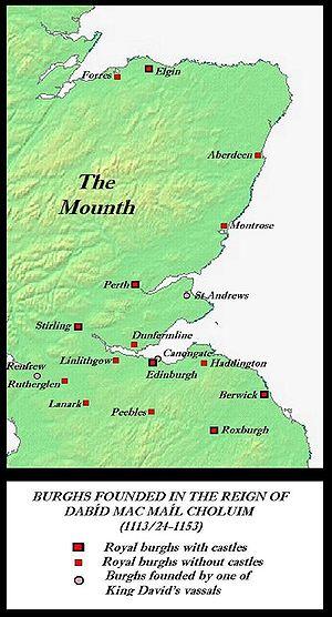 Before the reign of David I Scotland had no towns. The closest thing to towns were the larger than average population concentrations around large monasteries, such as Dunkeld and St Andrews, and regionally significant fortifications. Scotland, outside Lothian at least, was populated by scattered hamlets, and outside that area, lacked the continental style nucleated village. David I established the first burghs in Scotland, initially only in Middle-English-speaking Lothian (note:Tain claims a charter dating from 1066 under Malcolm III). The earliest burghs, founded by 1124, were Berwick and Roxburgh. However, by 1130, David had established burghs in Gaelic areas: Stirling, Dunfermline, Perth and Scone, as well as Edinburgh. The conquest of Moray in that same year led to the establishment of burghs at Elgin and Forres. Before David was dead, St Andrews, Montrose, and Aberdeen were also burghs. In the reigns of Máel Coluim IV and William, burghs were added at Inverness, Banff, Cullen, Auldearn, Nairn, Inverurie, Kintore, Brechin, Forfar, Arbroath, Dundee, Lanark, Dumfries and (uniquely for the west coast) Ayr. New Lothian burghs also came into existence, at Haddington and Peebles. By 1210, there were 40 burghs in the Scottish kingdom. Rosemarkie, Dingwall and Cromarty were also burghs by the Scottish Wars of Independence.