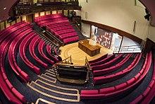 The institution's palatial home has been greatly enlarged and redeveloped since 1799, and is a Grade I listed building.[24][25] The structure's last refurbishment was a £22 million project completed in 2008, intended to create a "science salon" for the public. As well as the famous Lecture Theatre, the building contains several function rooms, modern research facilities and a public café. The trustees were considering selling the building in an effort to recoup the organisation's debts, which amounted to £7 million.[26] In 2013 The Ri received an anonymous donation of £4.4m[27] and as of January 2016, the Ri is now debt-free.