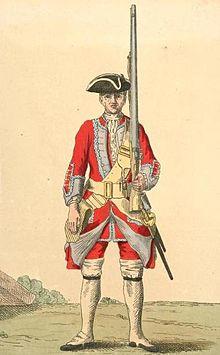 In 1726 the regiment moved to Menorca[12] and in 1751 a royal warrant assigned numbers to the regiments of the line, and the unit became the 17th Regiment of Foot.[13] The regiment embarked for Nova Scotia in 1757 for service in the French and Indian War;[13] it fought at the Siege of Louisbourg in June 1758,[14] at the Battle of Toconderoga in July 1759.[15] The following year, the regiment took part in the successful three pronged attack against Montréal in September.[16] It also saw engagements in the West Indies in 1762 and during Pontiac's Rebellion before eventually returning to England in 1767.[17]