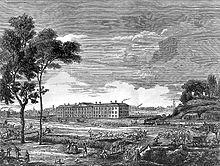 In May 1741, the hospital moved to larger premises in Prescot Street, at that time in an exceedingly bad district. The following year, 2nd Duke of Richmond was persuaded by the hospital's surgeon, John Harrison, to become the first President of the new hospital.[2]:31 The name changed to the London Hospital around 1748. The houses at Prescot Street were in an unfit state for use by 1744. A subscription fund for a new building was opened, and the current site was acquired at Whitechapel Mount (then relatively sparsely built on); however, funds were acquired slowly and it was not until 1751 that work began on the new building.[5] The purpose-built hospital, which was designed by Boulton Mainwaring[5] and accommodated 300 beds was opened to staff and patients in September 1757.[2]:111–135 The next year, the trustees of the charity acquired a royal charter so that they could constitute themselves as a legal entity.[2]:140