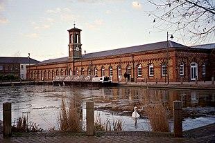The factory was to be located at Enfield Lock on a marshy island bordered by the River Lea and the Lee Navigation. The land was acquired in 1812 and the factory completed by 1816.[2] The site had the advantages of water-power to drive the machinery and the River Lea Navigation for the transportation by barge of raw materials and finished weapons to the River Thames, 15 miles away to be loaded onto sailing ships. Neighbouring farmland was acquired to become a restricted area to test ordnance from the Royal Gunpowder Mill. The RSAF was originally all situated on the east side of the Lea, in the county of Essex in Waltham Abbey parish, Sewardstone hamlet. The course of the river was diverted during the life of the factory, and part of the site then fell in Enfield parish. Local boundary changes initiated by SI 1993/1141 after it closed transferred the site entirely from Epping Forest (district) to the London Borough of Enfield.