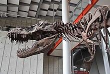 Other exhibits that display specimens from the museum's fossil collection includes the Dinosaur Hall, Fossils in Focus, and Triassic Giants.[21] Dinosaur Hall houses over thirty mounted dinosaur skeletons including specimens of an Albertosaurus, Camarasaurus, Triceratops, and a Tyrannosaurus, including Black Beauty, the fourteenth-most complete skeleton of a Tyrannosaurus in the world.[8][27] Fossils in Focus is an exhibit that typically displays specimens of interest for the museum's research program.[28] Triassic Giants is an exhibit dedicated to Elizabeth Nicholls, the museum's former curator of marine reptiles, and houses a specimen of a Shonisaurus, the world's largest marine reptile.[29]