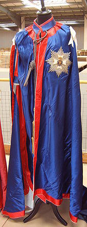 At formal events, or collar days, of which there are 34 throughout the year, such as New Year's Day and royal anniversaries,[10] Knights and Dames Grand Cross wear the Royal Victorian Order's livery collar, consisting of an alternating string of octagonal gold pieces depicting a gold rose on a blue field and gold oblong frames within which are one of four inscriptions: Victoria, Britt. Reg. (Queen of the Britons), Def. Fid. (fidei defensor, or Defender of the Faith), and Ind. Imp. (Empress of India). The chain supports a larger octagonal medallion with a blue enamel surface edged in red and charged with a saltire, over which is an effigy of Queen Victoria; members of the order suspend from this medallion their insignia as a badge apendant.[10][11] Though after the death of a Knight or Dame Grand Cross their insignia may be retained by their family, the collar must be returned. Knights and Dames Grand Cross also wear a mantle of dark blue satin edged with red satin and lined with white satin, bearing a representation of the order's star on the left side.[11]